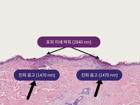 2940nm 파장은 물에 대한 흡수도가 매우 큰 에너지이기 때문에 수분이 많은피부 표피층(20-100um)의 흉터, 모공 등을 개선하여 피부 표면을 리모델링시키고, 1470nm 파장은 보다 깊은 진피층(100-700um)에 반응하여 콜라겐과 엘라스틴과 같은 탄력섬유를 재생시켜 광손상으로 인한 기미·색소 치료, 피부탄력 개선에 매우 효과적입니다.